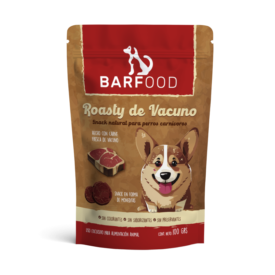 Dale a tu perro un premio irresistible y nutritivo con Roasty Vacuno, un snack natural perfecto para el entrenamiento, la recompensa diaria y el fortalecimiento del vínculo con tu mascota.
